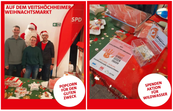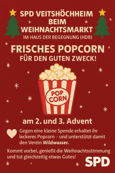 Der SPD‑Ortsverein Veitshöchheim hat an den ersten beiden Adventswochenenden auf dem Veitshöchheimer Weihnachtsmarkt wieder seine beliebte Popcorn‑Aktion durchgeführt – und damit nicht nur viele Besucherinnen und Besucher erfreut, sondern auch wichtige soziale Projekte unterstützt.